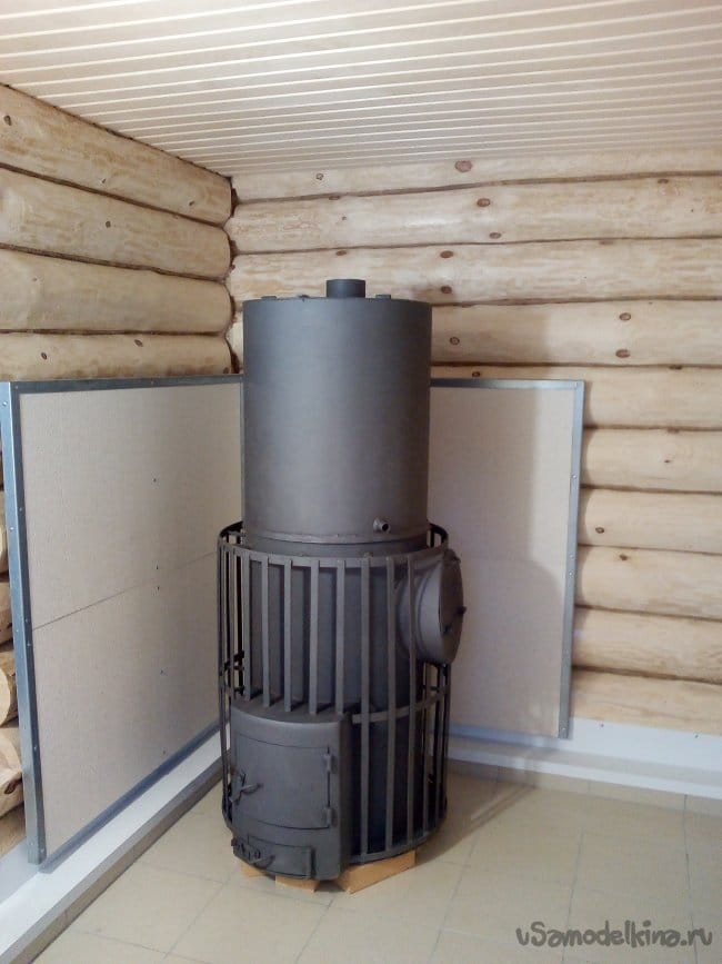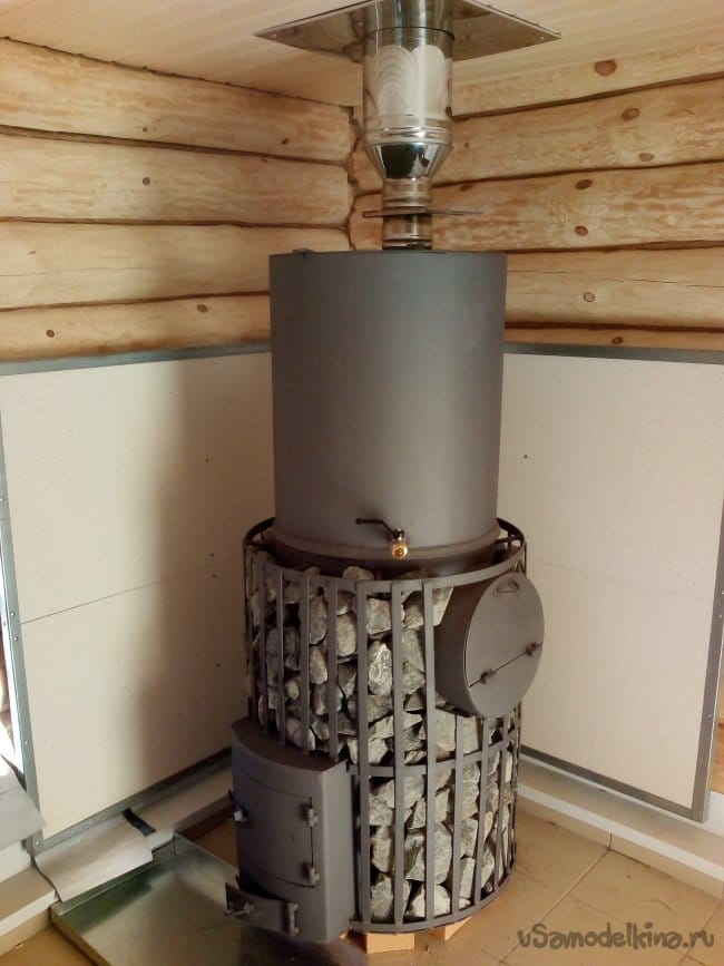 Печь заказывал на фирме. За основу была взята печь «Данила – 5» из 500-й трубы. Я же, дополнительно, при заказе «вынес топку наружу на 15 см и попросил изготовить дополнительно «рубашку» по кругу, на расстоянии 7 см. от стены топки. Поясняю, при закладке камней получается дополнительная теплоемкость и пожаробезопасность у стен сруба, значит печь можно сдвинуть в угол сруба, что увеличивает полезное пространство в бане. Бак сварен отдельно из такой же трубы и монтируется через асбестовый шнур на топку. Изначально предлагался бак из нержавейки, но это «бьёт по кошельку», да и толстостенная труба более инертна от закипания воды в баке, а потом дольше держит тепло, так же нужно учитывать нагрузку, которая понесет сэндвич труба (тоже не легкая оказалась). Камни использовал габбро – диабаз. В рубашку и парообразователь ушло 8 коробок, по 20 кг. После установки дымохода протапливал печь несколько раз, чтоб краска выгорела.
