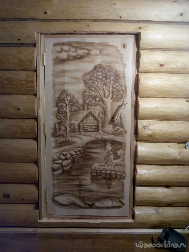 Дверь делали под заказ, липовый массив на иглах, с 3д рисунком «Одинокая елка», размером по косяку 160х80, Устанавливали в распор. Сверху над косяком оставили зазор на усадку бревен сантиметра 3-4. Все щели законопачены джутовой лентой.