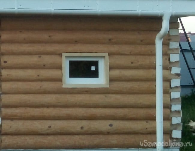 Окно - фрамугу пластиковое 700х500, в 2 стекла, купил готовое, в хозмаге. Перед его установкой собрал из брусков опорный каркас- четверть, сделал это для того, что бы нагрузки при усадке сруба легли на каркас, а не на стеклопакет. Все щели так же законопачены джутовой лентой.