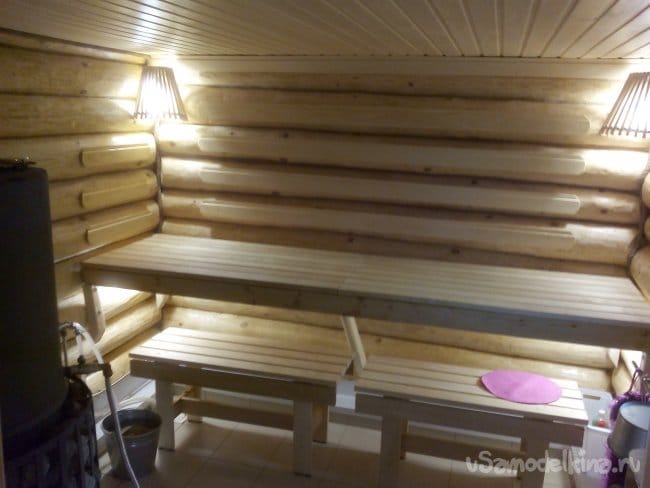 Получилось крепко и надежно. Опять же подвесной полок экономит полезное пространство бани. Лавки (смотри предыдущие статьи)[/i] используются как ступеньки и для мытья, спокойно задвигаются под полок.