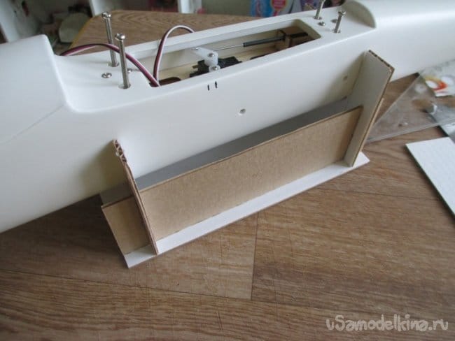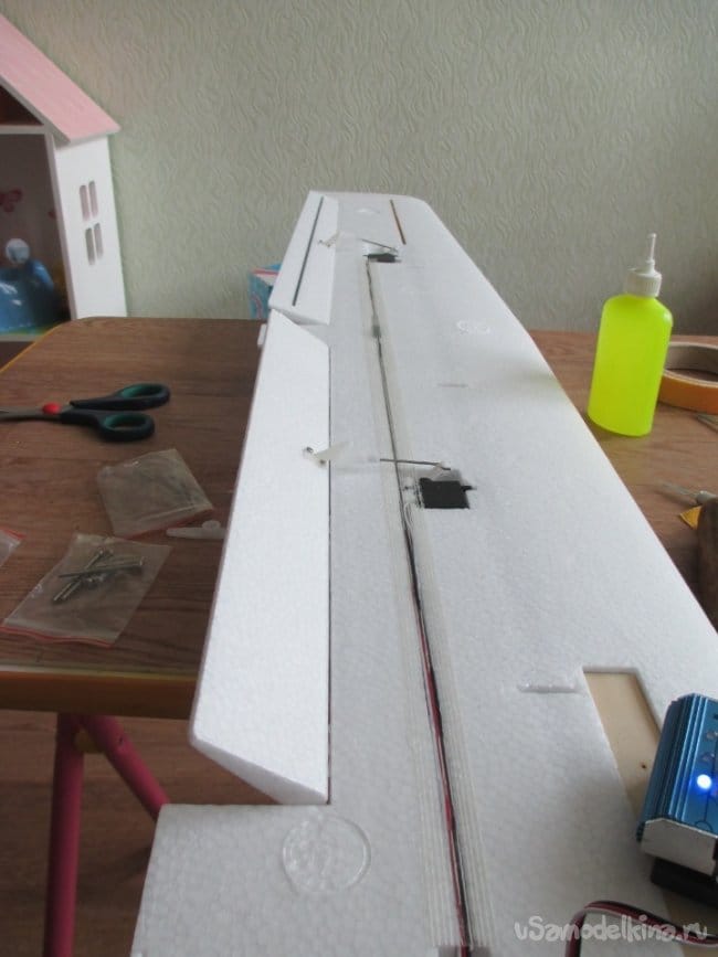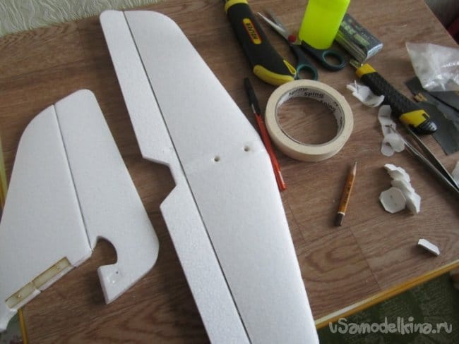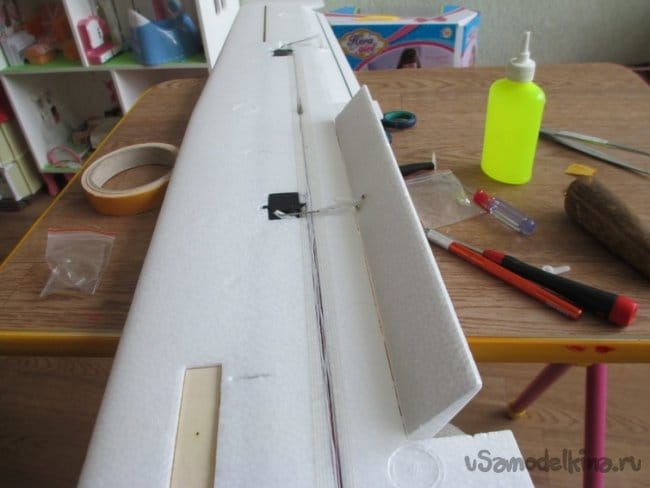 Следующим этапом, отрезаю все рулевые поверхности. Навешиваю по новой на самодельные пластиковые петли. Слегка прохожу крупной шкуркой, для повышения адгезии и увеличения прочности вклейки.