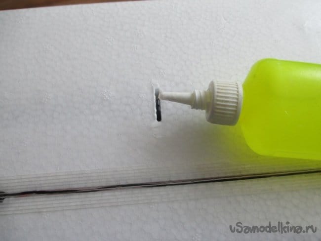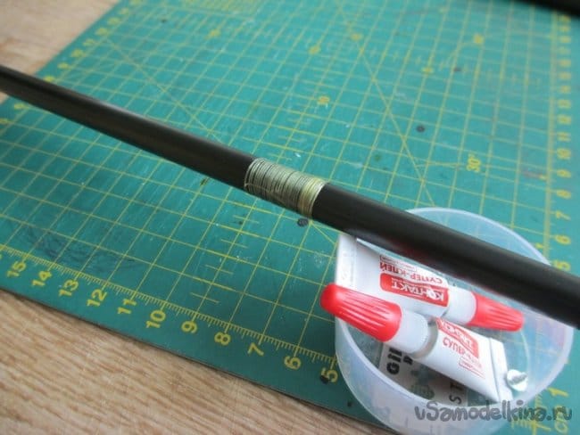 Карбоновые трубочки имеют нехорошую особенность растрескиваться по срезу при нагрузке. Сейчас буду исправлять. Отмерял нужную длину, край обматываю с натягом арамидной нитью, пропитываю циакрином и отрезаю в размер.