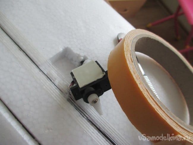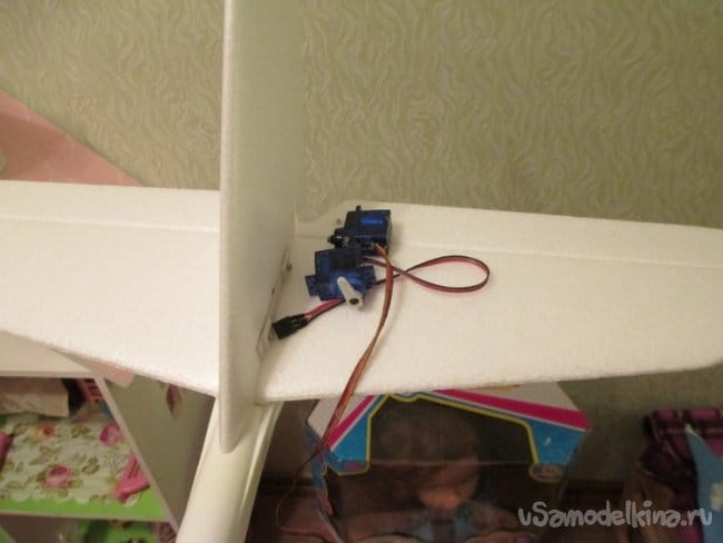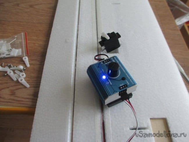 Проверил все сервоприводы, на них нет никаких обозначений, но сильно напоминают 900е с усилием в два кило. Установил обратно в крыло на двойном скотче для зеркал.