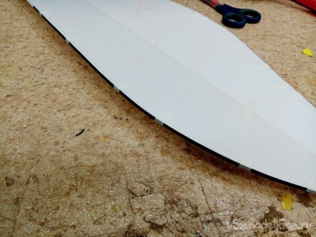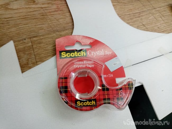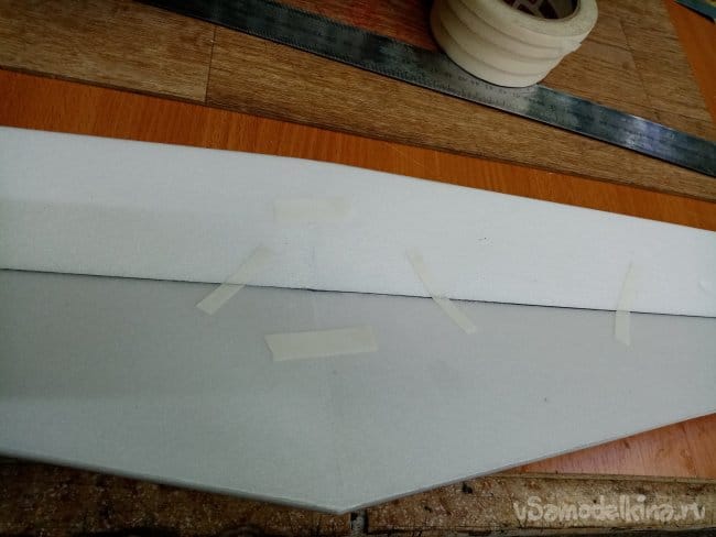 Основой конструкции являются парочка склеенных листов потолочки. Наношу клей на торцы, фиксирую малярным скотчем. Можно не ждать когда склеятся намертво, скотч держит листы, начинаю разметку.