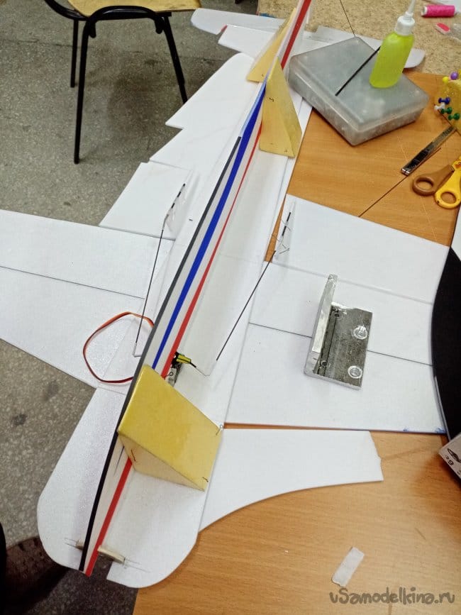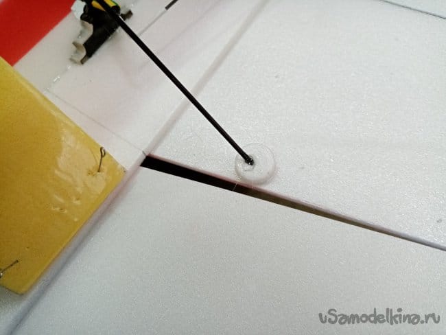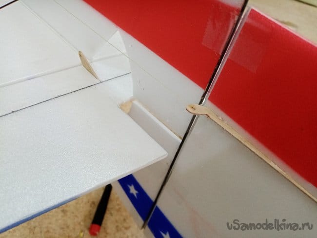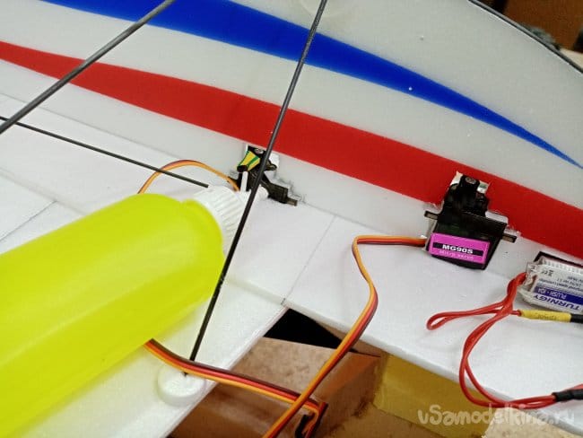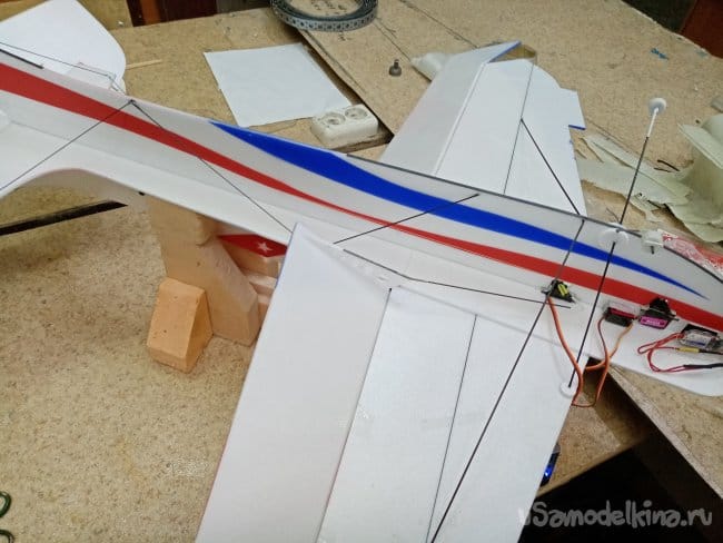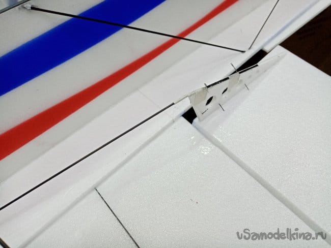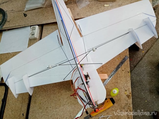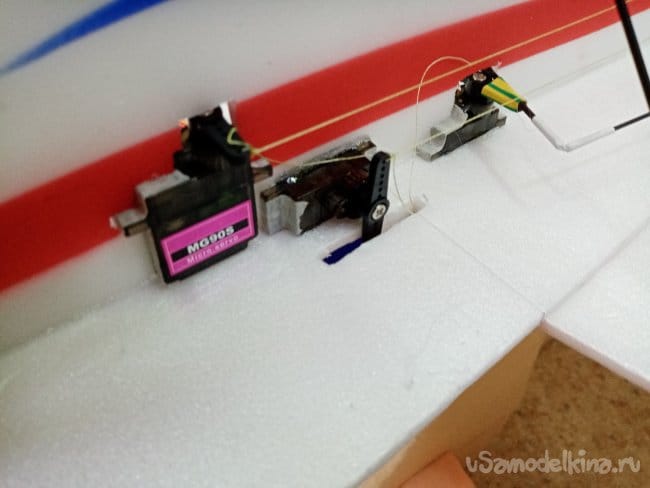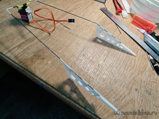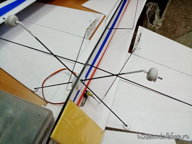 Управление на руль высоты, руль направления провел на нитках. Предварительно изготовил качалки из пластика и вклеил их в рулевые поверхности.