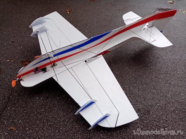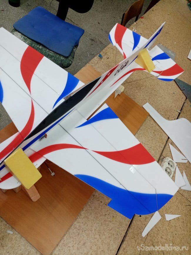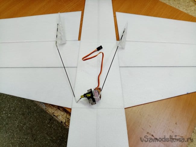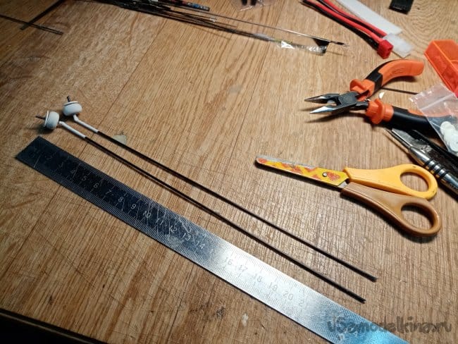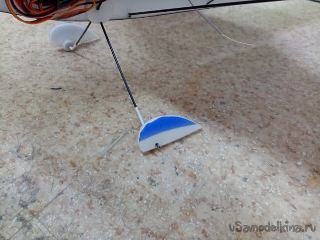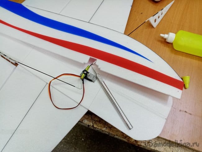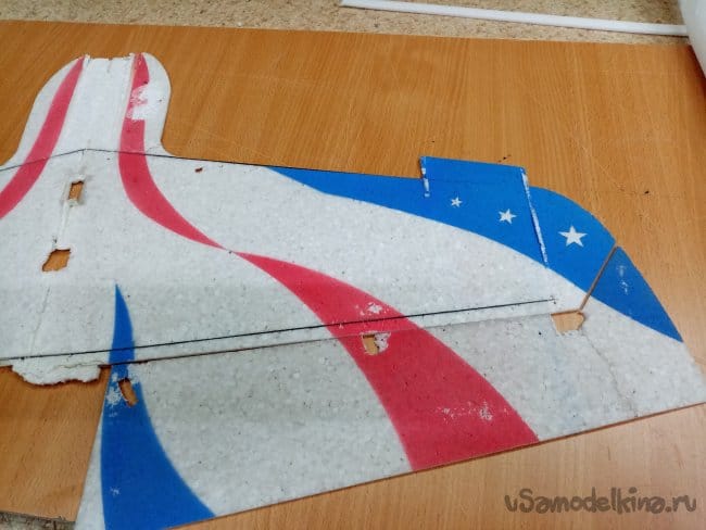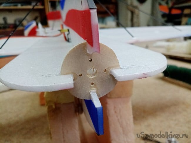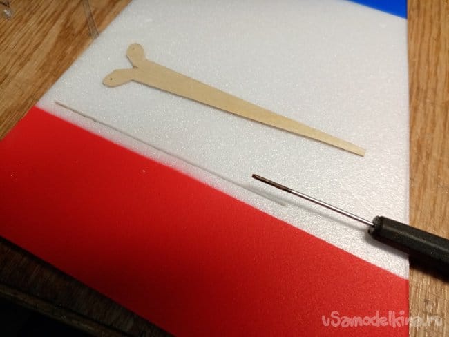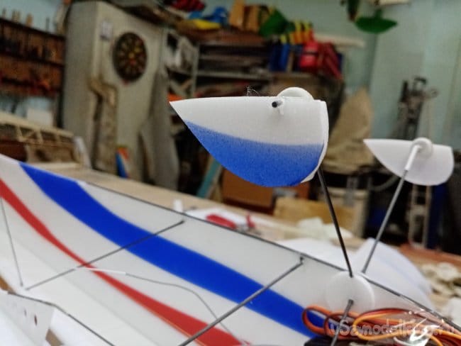 Управление на руль высоты, руль направления провел на нитках. Предварительно изготовил качалки из пластика и вклеил их в рулевые поверхности.