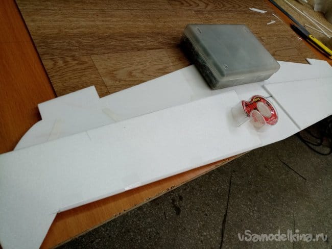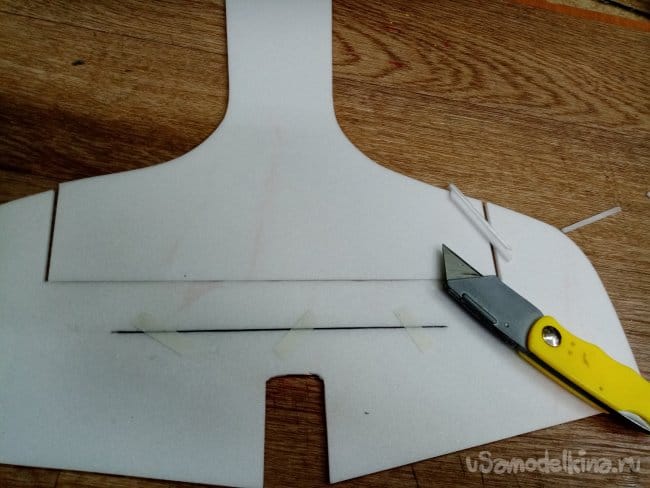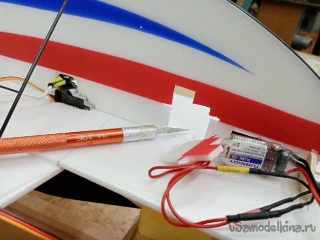 Прорезаю отверстия под сервоприводы, устанавливаю их на клею.
