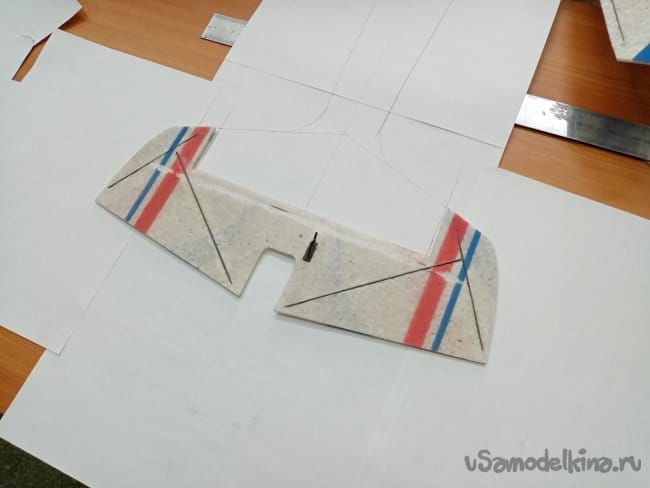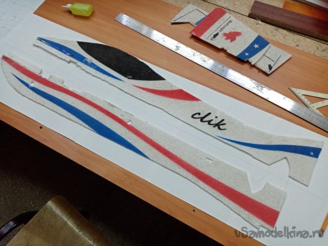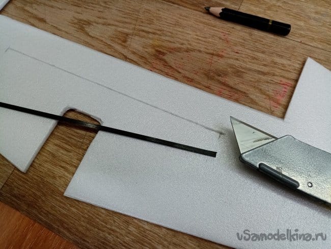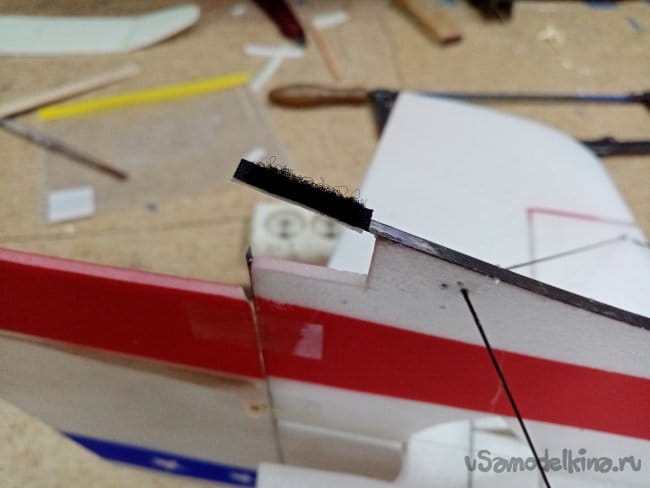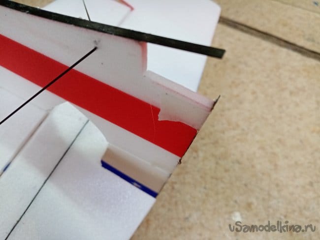 В крыло и руль высоты врезаю карбоновые рейки как на оригинале.