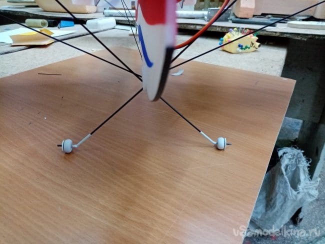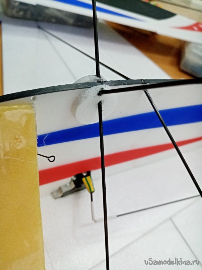 Трубочкой вырезаю усиливающие накладки из пенопласта, приклеиваю в размеченные места на фюзеляже и через них провожу стойки шасси. Заклеиваю на титане.