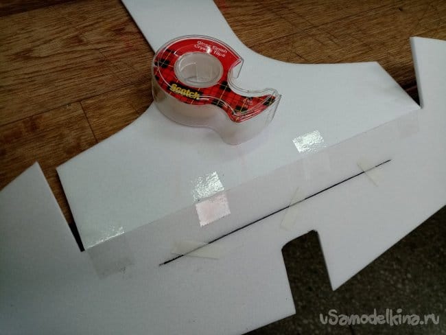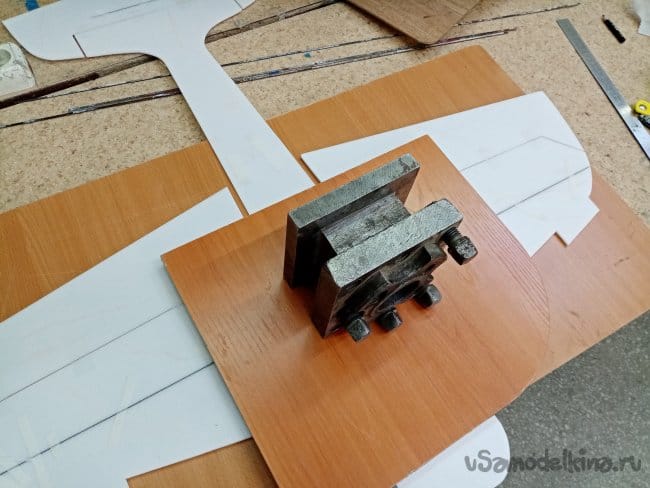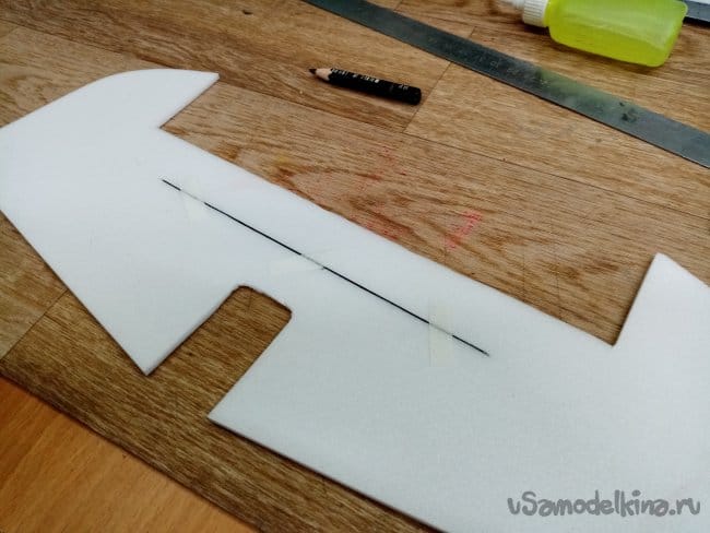 Размечаю место приклейки вертикальной нижней пластины фюзеляжа. Наношу клей и устанавливаю её на место, зафиксировав иголками и кубиками из теплоизоляции для строгой вертикальности.