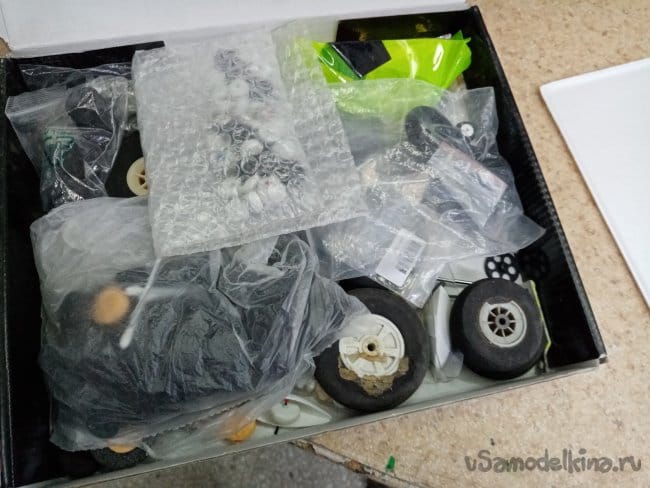 Из "колесного" ящика извлекаю готовые колеса, это вспененная резина. Стойки шасси угольный прутик в 2мм, согнутый по место паяльником, изгиб зафиксирован термоусадкой на циакрине.