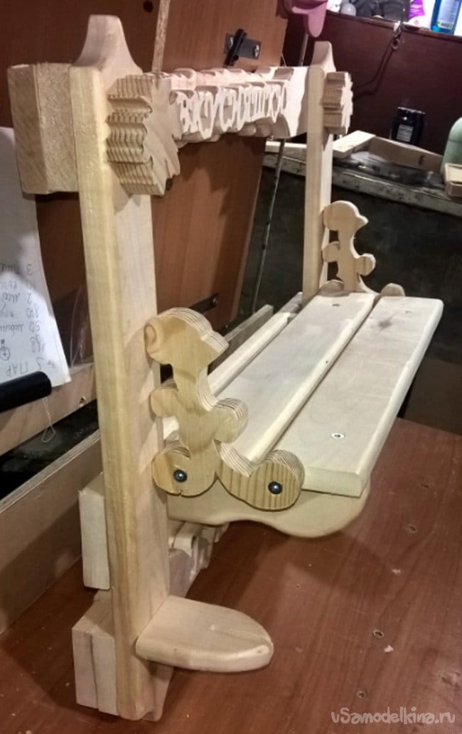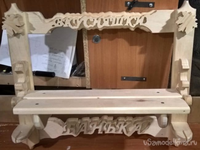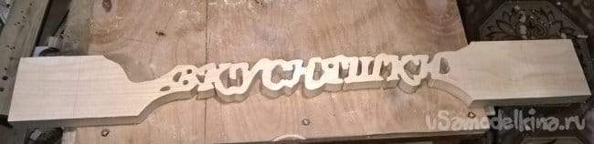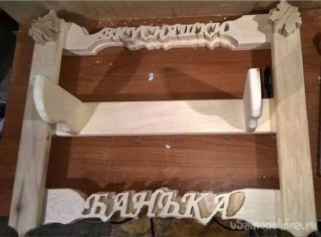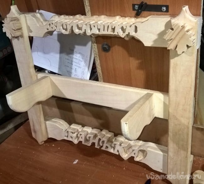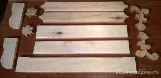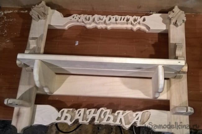 Прежде чем приступить к изготовлению полки, на компьютере разработал свой проект. Напечатал на самоклеющейся бумаге надписи узоры. Затем приступил к процессу изготовления заготовок. Напилил необходимое количество деталей нужного размера на циркулярной пиле и шлиф машинкой отшлифовал.