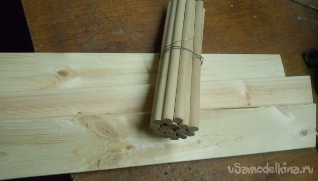 И что то мне его очень жалко стало использовать по назначению. Во первых нужно поддерживать в нем влажность, что б не протекал, да и при запаривании веников внешний вид у него будет не совсем презентабельный. Для запарки веников оцинкованное ведро самое то. Решил использовать запарник, как декор в комнате отдыха в бане, а так же для хранения разной мелочёвки. От самоделки, по имени «Абажур для светильника», остались деревянные шканты из березы, диаметром 16 мм. Да и от строительства бани, остались обрезки строганных сосновых досок (смотрите на сайте мои предыдущие статьи по самоделкам).