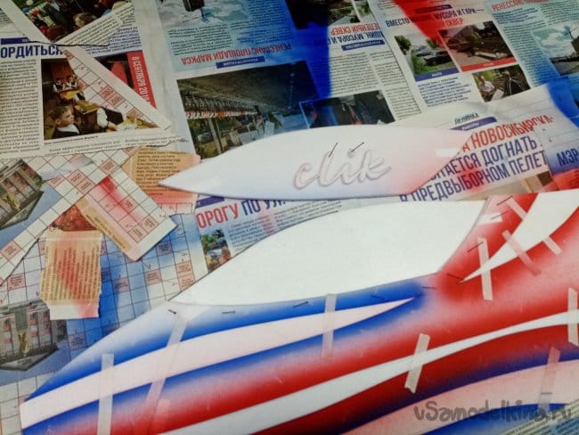 В качестве материала для него можно выбрать многие материалы. Например пленку прозрачную или не очень, толщиной в 03мм. Пленка не набухает и не коробится от влаги, поскольку акрил водная краска. Достаточно жесткая, не будет подниматься под струей воздуха. Применял подобные варианты. Но пленку нужно прижимать к изделию, иначе просто сдует. Для этой цели применял различные "отягощения" из болтов гаек и даже камушков. После покраски с пленки можно ненужную краску просто смыть с нее водой. К сожалению не нашлось у меня куска жесткой пленки нужного размера, на всю модель.