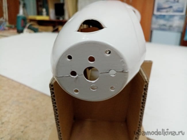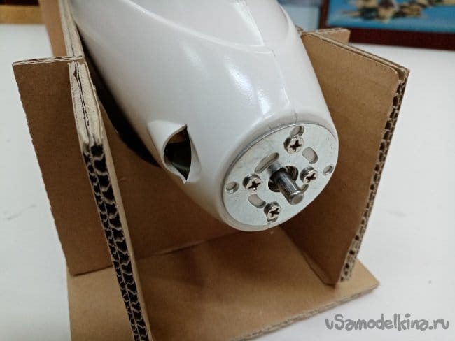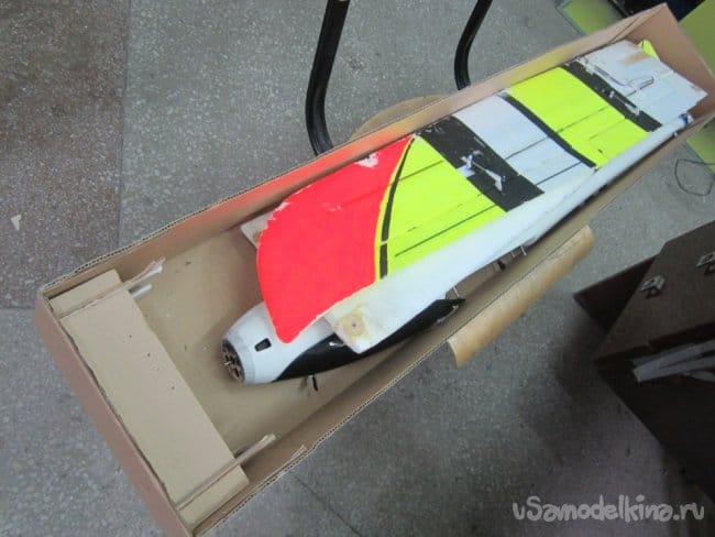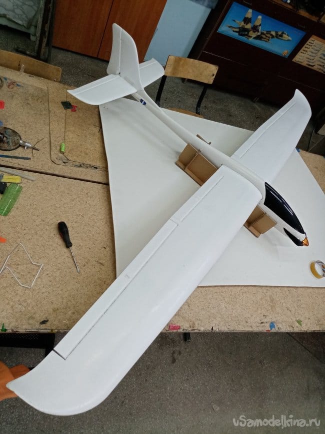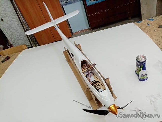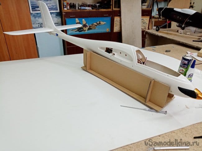 Изготовил стапель, из картона, чтобы фюзеляж не катался по столу при работе.