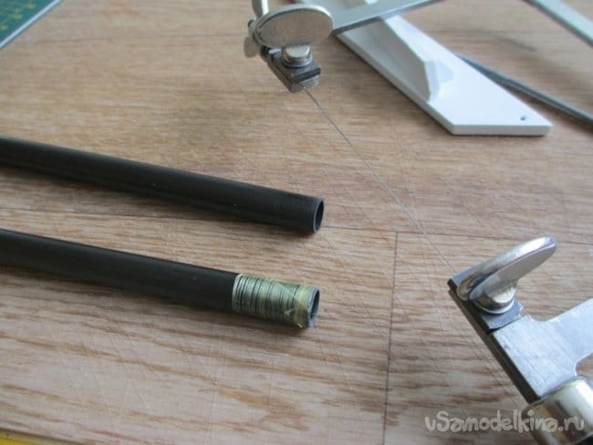 Внутри самого крыла как ив 2000 варианте проходит достаточно мощная четырехгранная труба. Не долго двумя попытался извлечь эти "рельсы", при помощи тонкогубцев с одним крылом все прошло на ура, со вторым пришлось повозиться достаточно долго. Поучилось четыре трубы, две длинные, две короткие. Заменил их на угольные трубки. действия как и в предыдущем проекте, обматываю концы угольных труб арамидной ниткой на циакрине. Этот прием предотвращает от растрескивания края при нагрузке.