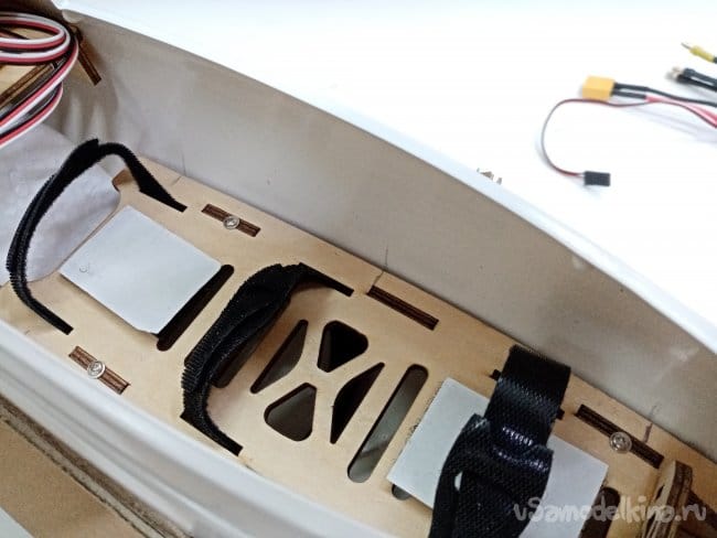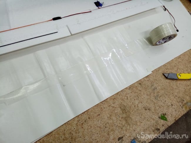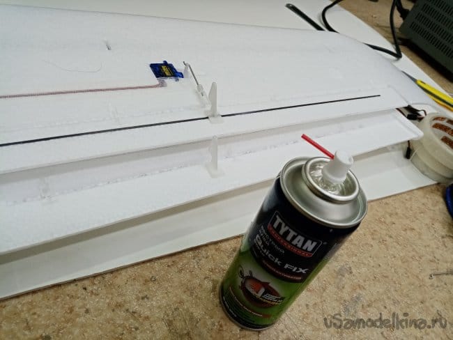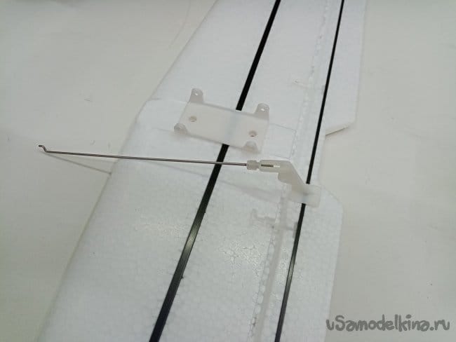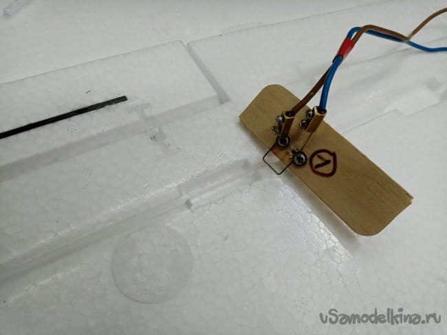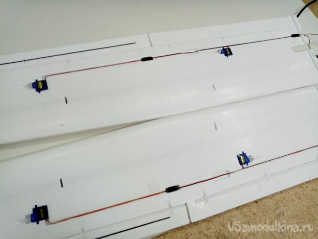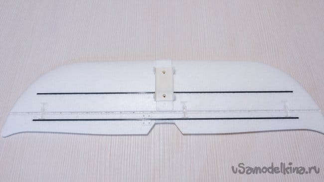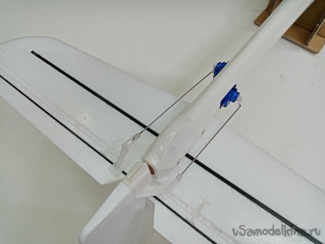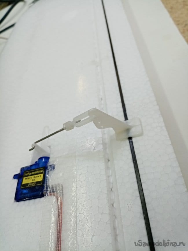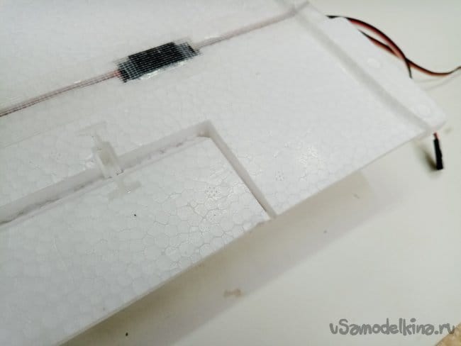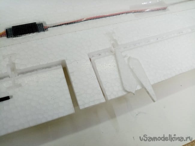 Рулевые поверхности навешены на тонкий слой пены сформированный при отливке, дополнительно усилены пластиковыми накладными петлями. Хорошее решение, в первом самолетике 2000 Ом, мне пришлось полностью срезать все элементы и навесить по новой на самодельные пластиковые петли.