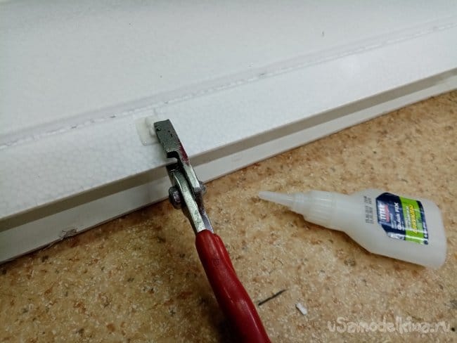 Кабанчики из пластика на защелках устанавливаются в прорези насквозь. Для надежности еще и заклеил из на циакрин с фиксатором.
