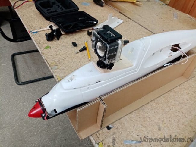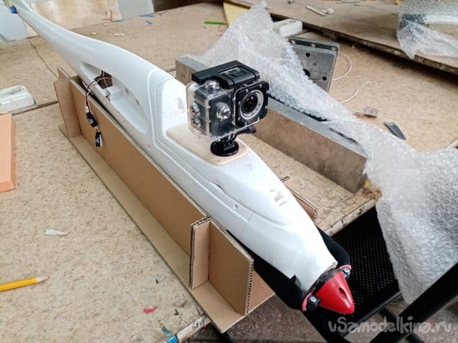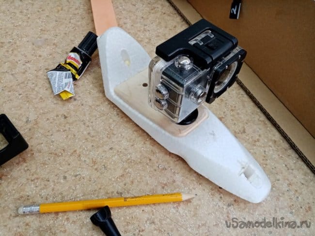 под конец малость модернизировал платформу для установки видеокамеры. Она полностью отлита из ЕРР пенопласта и мне показалась довольно хилое крепление в районе камеры. Выпилил накладки их 4 мм фанеры, приклеил на ПУР 501.