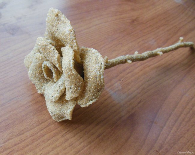 Часть поделок делается самым банальным и бессовестным способом. Например, цветок из песка. Делается каркас из проволоки и аккуратно покрывается клеем ПВА, а потом и песком. Листики его готовятся следующим способом. Вырежьте из пластиковой бутылки нужный вам формы лепесток и обмажьте его клеем и песком. Потом нанесите еще один слой. Через часов семь — восемь осторожно отделите песчаную копию от пластиковой. Далее нужно прикрепить песчаный лепесток к стеблю. Это делается с помощью клея и песка. Внимание, приклеивание довольно муторное занятие... Не спешите!