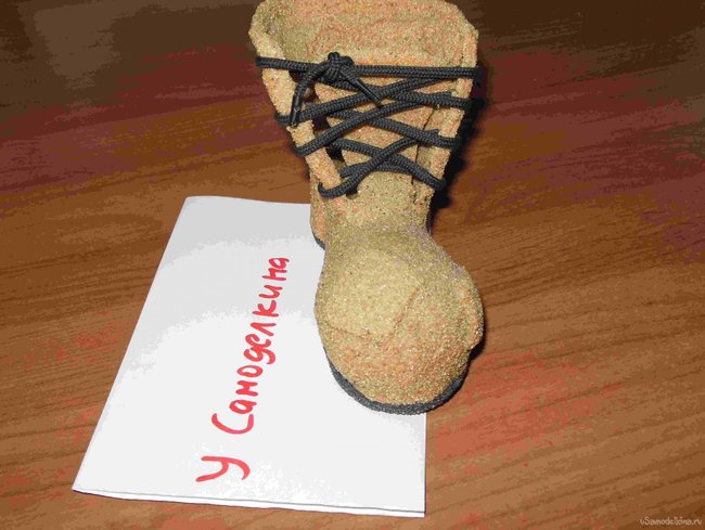 Другая часть поделок, например ботинок, делается более сложно. Сначала готовиться каркас из пластилина и обмазывается каким-нибудь маслом. Потом на него медленно, кусочками, наносится клей и песок. И таким образом, шаг за шагом покрывается весь каркас.