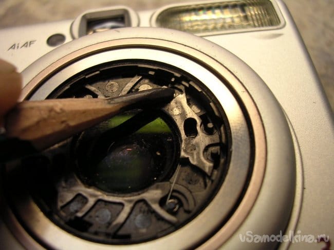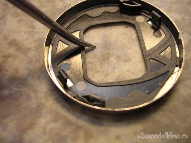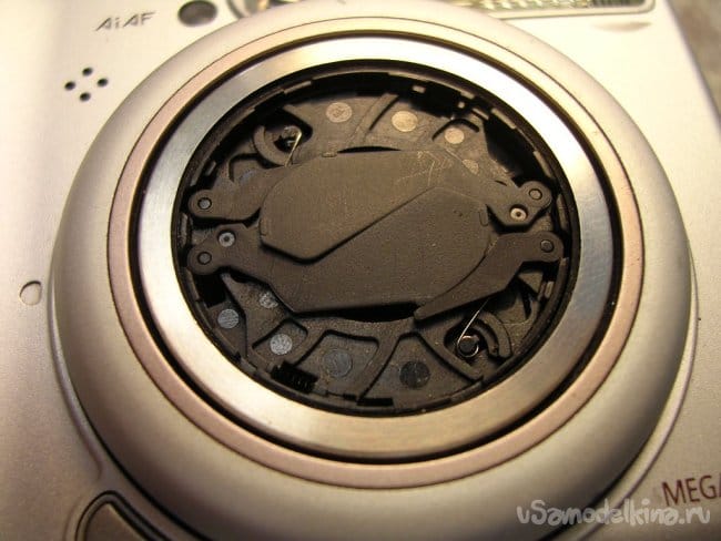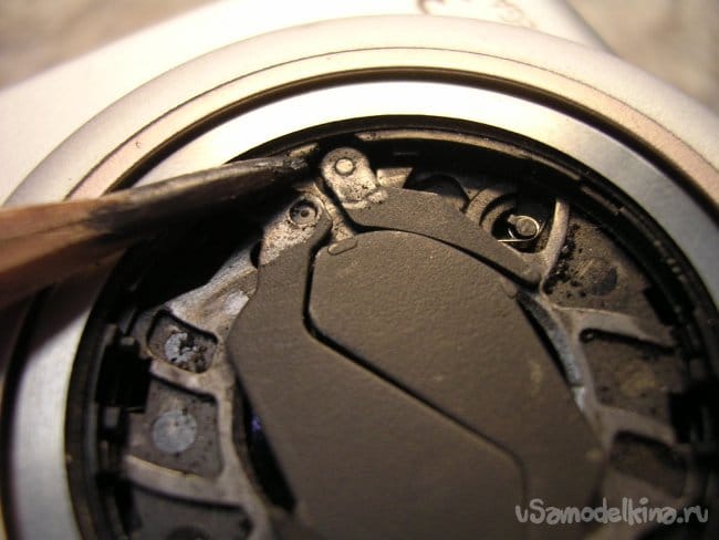 Затем с величайшей осторожностью снимаю сами лепестки, стараясь не потерять возвратные пружинки. Они такие маленькие и прыгучие. Гладким пинцетом протираю грани отверстия вокруг фронтальной линзы объектива, слегка их закругляю.