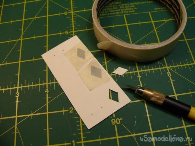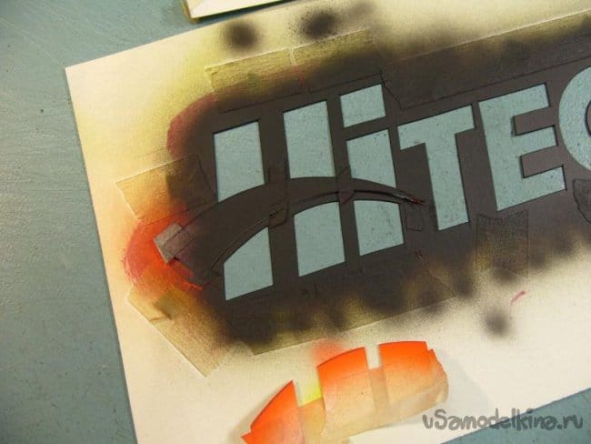 Закрепляю пластину трафарета на обыкновенную изоленту. Она достаточно липкая, но не сильно и не отрывает нижние слои краски при снятии. Понятно, нужно хорошо просушивать предыдущий слой краски при наложении следующего. В плоскости трафарета прорезаю окна, их заклеиваю пленкой и таким образом фиксирую трафарет на детали.