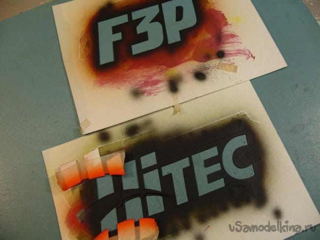 В принципе можно достаточно эффективно использовать малярный скотч, ну если совсем ничего под рукой нет. Рисую буквы прямо на скотче карандашом, вырезаю. Можно аккуратно отделить буквы от подложки, можно перенести на модель при помощи другого скотча. Его предварительно тру об джинсы. с целью уменьшить липкость и наклеиваю сверху на вырезанные буквы. затем переношу на модели и снимаю переносной скотч, отклоняя его под 189 градусов назад. Если буквы плохо отделяются от переносного скотча, можно малость подорвать их ножиком.