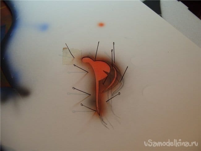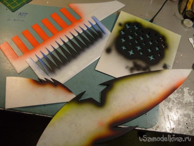 При массовом изготовлении зальных тренировочных самолетиков, нарезал различных трафаретов из потолочки побольше. Закреплял при помощи иголок. Вот такой конвейер. При покраске нескольких моделей значительно сокращается время. Не нужно сушить каждый слой. Просто откладываешь в сторону покрашенное и делаешь другое. Пока первое сохнет.