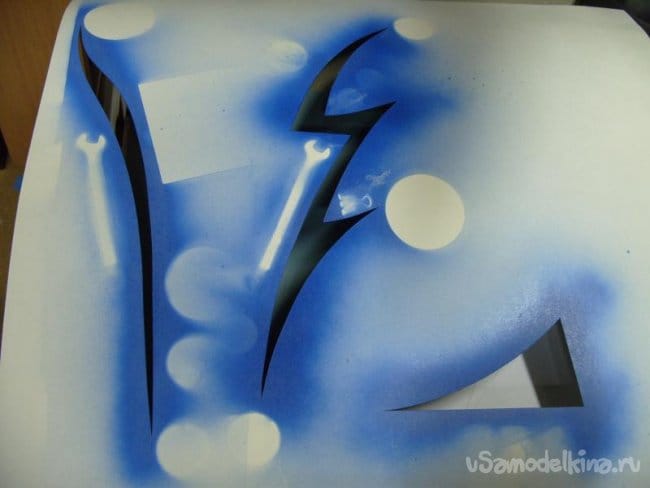 Окрашиваю самолетик и аккуратно снимаю буквы, получаются белые на синем фоне.
