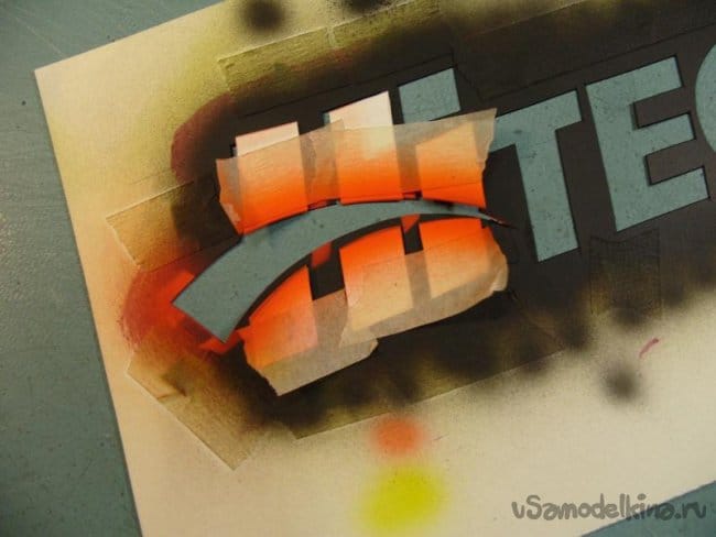 Зубчатый сдвижной трафарет. Напыляю один цвет, сдвигаю наискосок и наношу следующий. Моя любимая глубокая черная в конце.