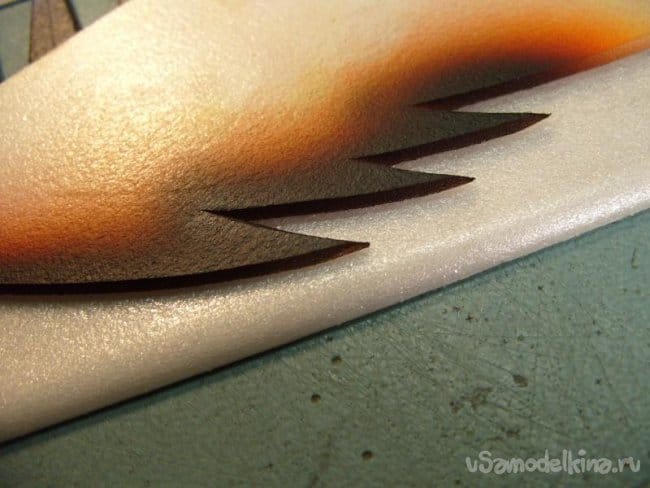 Можно прямо на пенопласте подрезать полоски под нужным углом. Для этого подкладываю под них кусочек пластика или ту-же подложку от рекламной пленки. Чтобы случайно не порезать самолетик. Затем подрезаю полоски и снимаю их с подложки, наклеиваю на модель.