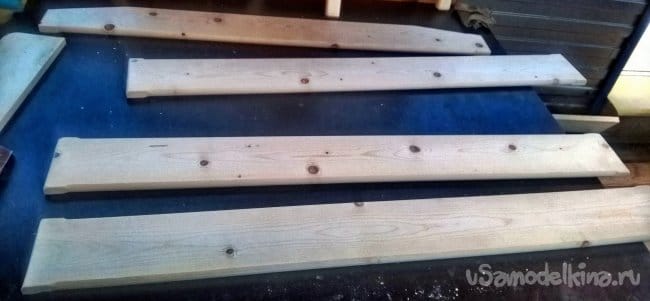 Доски использовал обрезного типа 150х25 мм. Бруски, которые имеют размеры сечения 50х50 мм. Эти элементы потребуются для изготовления основных рам и ножек. После того как нарезав заготовки в нужные размеры, ручным фрезером используя радиусную фрезу закруглил грани в нужных местах. Затем шлиф машинкой отшлифовал основное и вручную наждачной бумагой доработал.