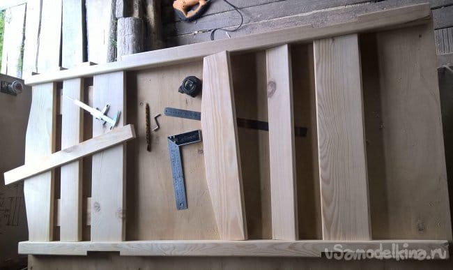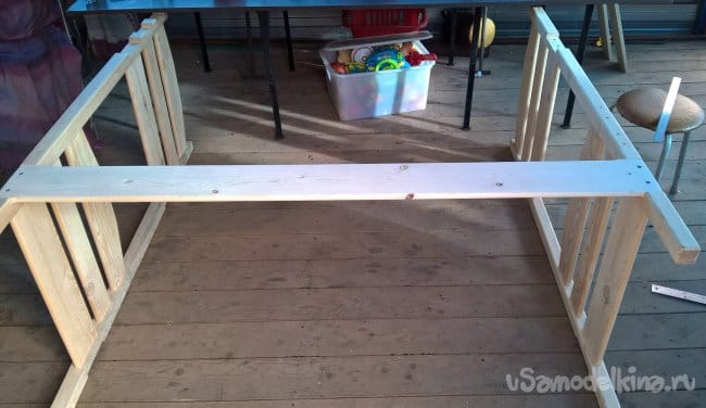 Затем, когда основные заготовки привёл в нужный вид, проверил, чтобы не было, сколов и различных дефектов, собрал в первую очередь боковины кроватки. Высота 700мм. Ширина 850мм.