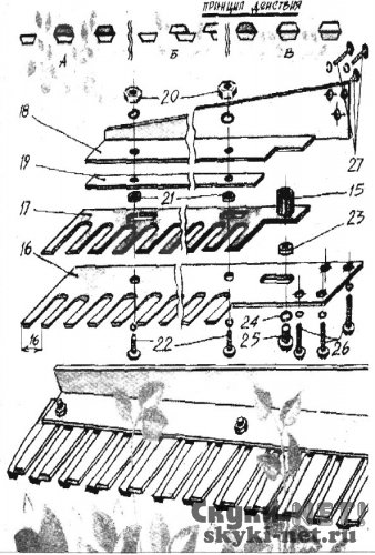 Наложив их на полотно, переведите контуры чертилкой на металл. Теперь сверлом — отверстие к отверстию - вы сможете вырезать черновые заготовки. Их еще надо обработать напильником и наждаком. Если полотно поддается обработке с трудом, отпустите его: нагрейте до появления на поверхности цветов побежалости и медленно охладите -лучше всего в противне с горячим песком. На мягком металле окончательно обработайте зубья ножа и гребенки (как показано на рис. 16, под углом 45°); высверлите необходимые отверстия под направляющие шайбы 21 для крепежа 22, 24, 25, 26 и только потом металл закалите; отшлифуйте рабочие поверхности. Для сборки всего приспособления вам еще потребуются: болты и гайки 9, 20, 22, 24, 25, 27— они стандартные; направляющие шайбы 21, 23 — выточите их из бронзы; захват для приведения ножа в движение 75 — он выточен из инструментальной стали. В косилке возникнут неизбежные вибрации, поэтому все винтовые соединения контрятся пружинными шайбами. Последней деталью завершающей работы будет фасонный кожух 5 для защиты рабочих органов от пыли. Его лучше вырезать из листового дюралюминия толщиной 1 — 1,5 мм. Прежде чем приступать к работе, хорошенько смажьте все трущиеся детали.