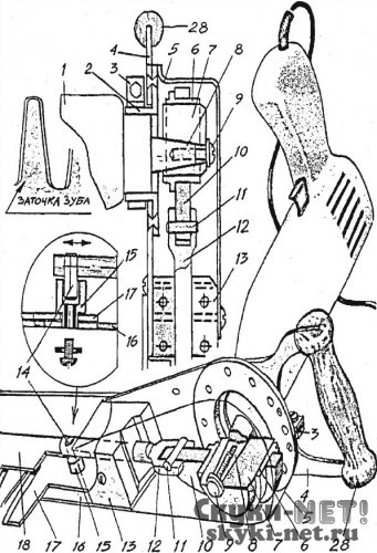 Направляющая 13 представляет собой брус с базовой длиной не менее 50 мм. Лучше всего изготовить ее из стали. Основное внимание обратите на то, чтобы ось рабочего отверстия под шток была строго параллельна плоскости опорной пластины 4. Остальные отверстия — крепежные, с резьбой под винты М5 или Мб. Изготовление гребенки и ножа — самое трудоемкое дело, поэтому остановимся на нем поподробнее. Здесь хорошим материалом для вас может послужить полотно старой двуручной пилы. Вычертите точный чертеж ножа и гребенки на миллиметровой бумаге (размеры их приведены на рисунке, заметим лишь, что у ножа 19, а у гребенки 20 зубьев). Наклейте чертеж на картон и вырежьте по контуру. У вас получились шаблоны.