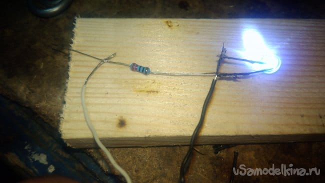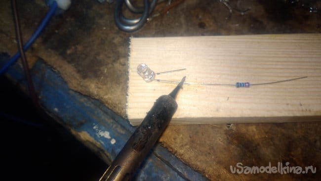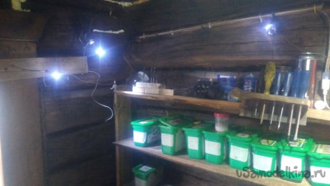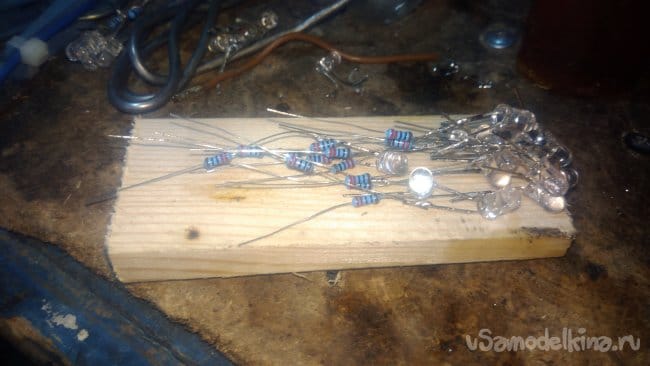 Для начала нам понадобиться светодиод. У него есть + и -.Плюсовая нога больше чем минусовая..К + припаиваем резистор на 220 ом(если чо резистор можно вешать на + и на -).Теперь мы берём провод двужильный и его тоже припаиваем к нашей сборке.Таким макаром у меня получилась кучка светилок.Я развесил это всё по стеллажу. И до.Сейчас не видно разницы но вот вечером разница огромна.Ну а на этом я прощаюсь и желаю вам чтобы у вас в мастерской не было тёмных мест.