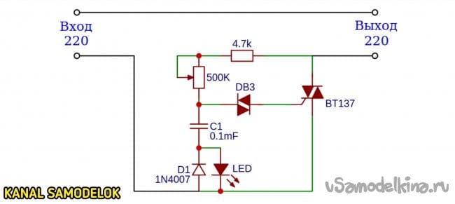 Давайте рассмотрим принцип работы схемы. Переменным резистором на 500к мы задаём время заряда конденсатора (чем больше сопротивление тем дольше будет заряжаться). Когда конденсатор зарядиться до 32В в этот момент откроется динистор DB3 и пропустит через себя ток и на управляющий вывод симистора оно поступит и он откроется и через себя пропустит нагрузку. В это время конденсатор разрядиться и напряжение будет ниже 32 В и динистор закроется и в тоже время закроется симистор и не будет пропускать через себя нагрузку и так повторяется снова и снова. Светодиод служит в качестве индикатора работы но если вам этого не надо то можете его исключить из схемы но также потребуется отпаять и диод.