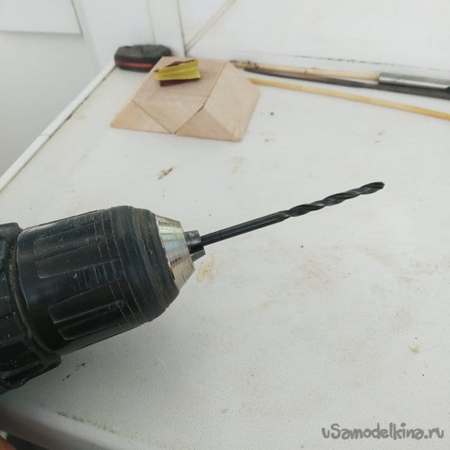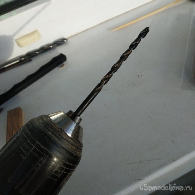Теперь надо просверлить мундштук с двух сторон, потому что я не купил длинное сверло на 3,5 мм. А надо было. Сверла не хватило.