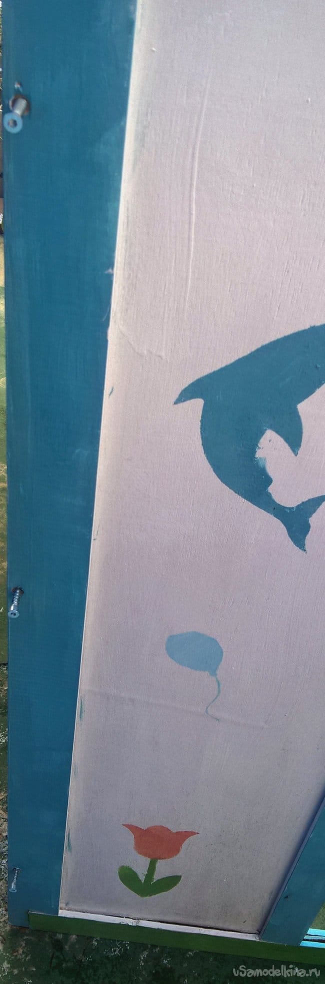 А чтобы домик был красочным и ярким, достаточно его немного преобразит, разукрасив красками. Перед покраской прошёлся шлифовальной шкуркой. Краску использовали белую фасадную, сперва полностью всю конструкцию покрыли на два раза белым цветом. Чтобы придать домику, красочный вид в отдельной емкости добавляли колер для придания нужного цвета. На принтере распечатали различные рисунки и изготовили трафареты. Затем нанесли на стены внутри и снаружи.