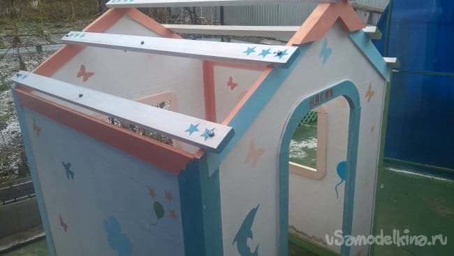 После того, как основа детского домика из фанеры готова, на него можно установить крышу. Изготовил стропила из 6 реек по 3 штуки на сторону.