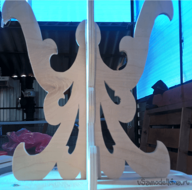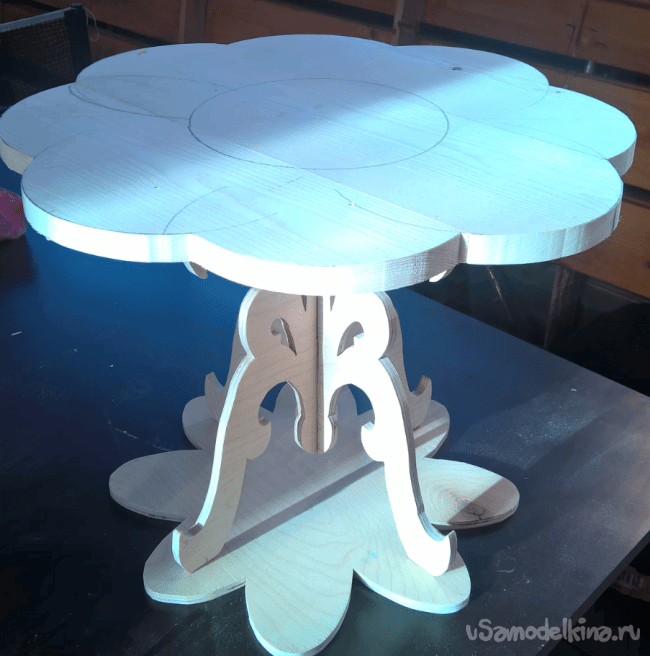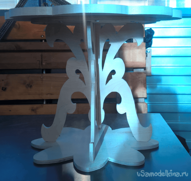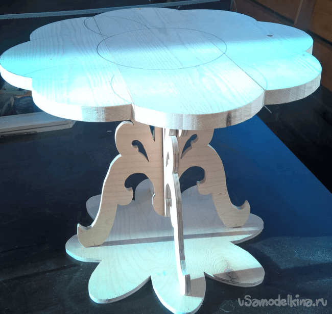 Для изготовления ножек использовал фанеру 10мм, а столешницу из обрезной доски. На самоклеющейся бумаге распечатал узоры ножек. Наклеив на фанеру и лобзиковым станке вырезал узоры.