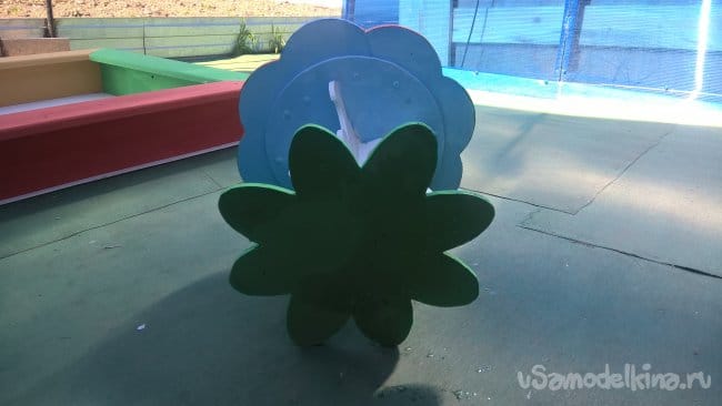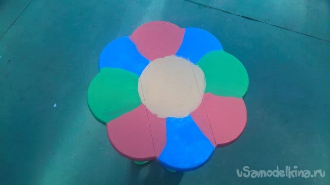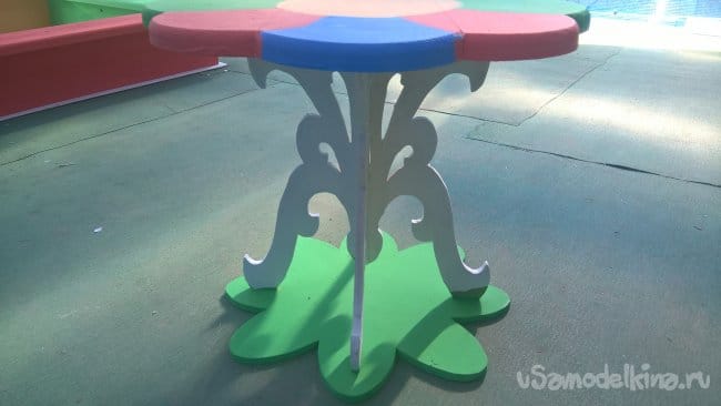 Если со скамейками более мене все понятно, то столик хотелось сделать какой-нибудь необычный, чтоб был не большой, места много не занимал. Пришла идея изготовить в виде ромашки и с узорными ножками.