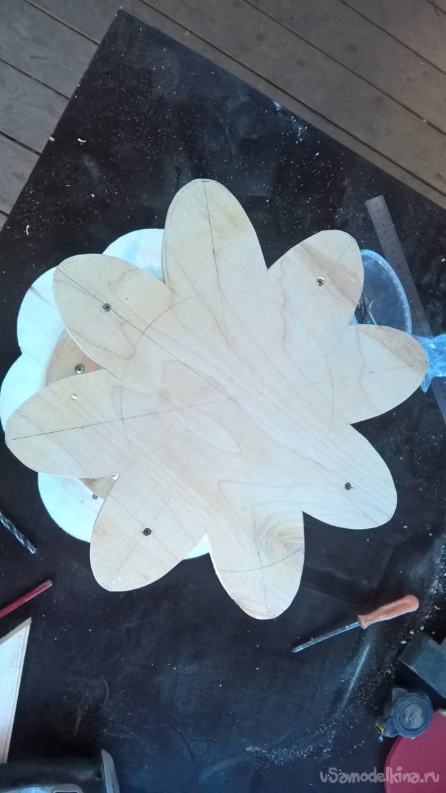 Из обрезной доски приготовил 3 заготовки, скрепив, их между собой прочертил рисунок в виде ромашки. Затем также вырезал лишнее. Все заготовки про шкурил наждачной бумагой, ручным фрезером снял фаски. После чего все детали скрепил саморезами и осталось покрыть краской.
