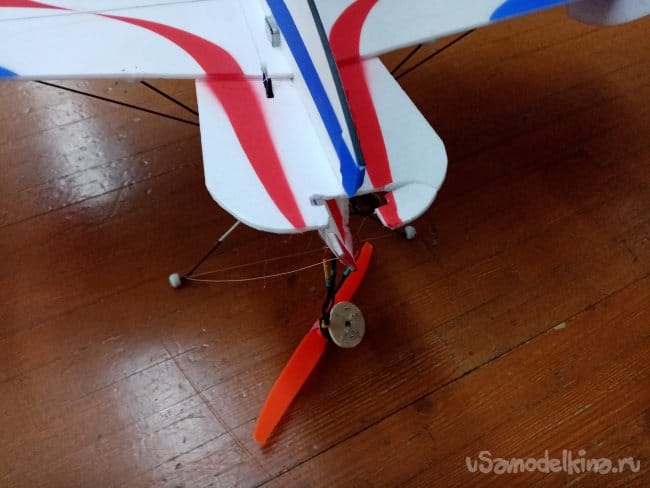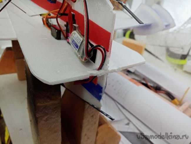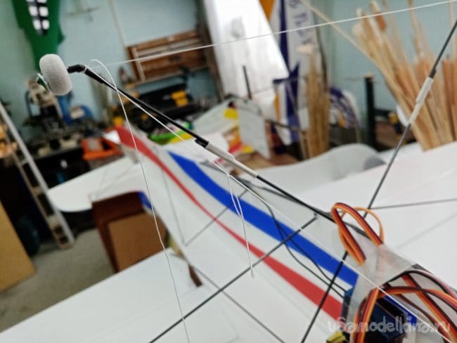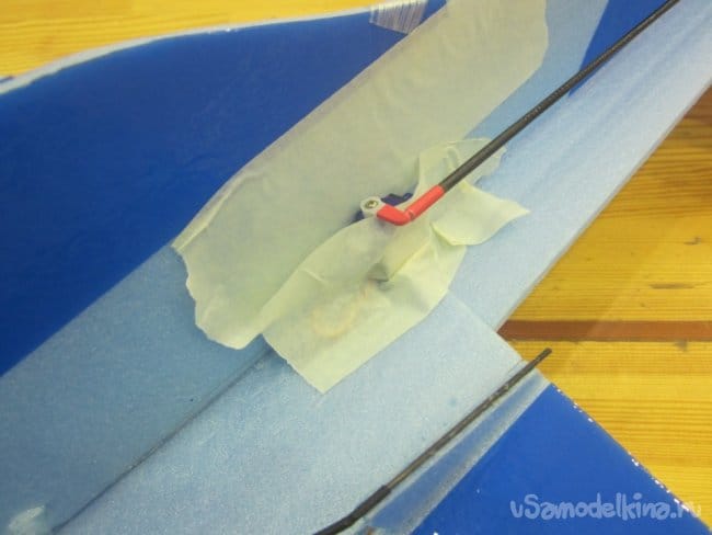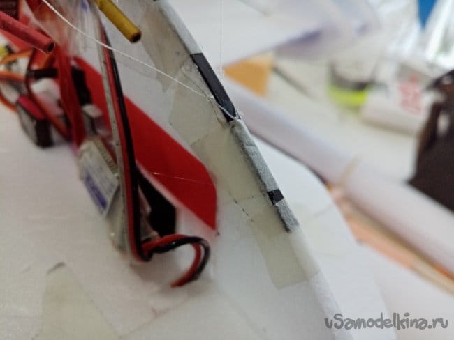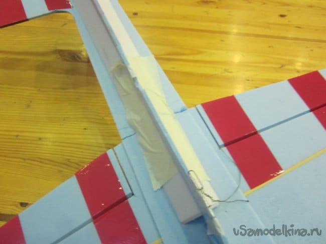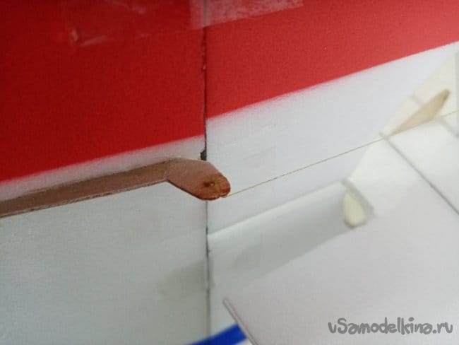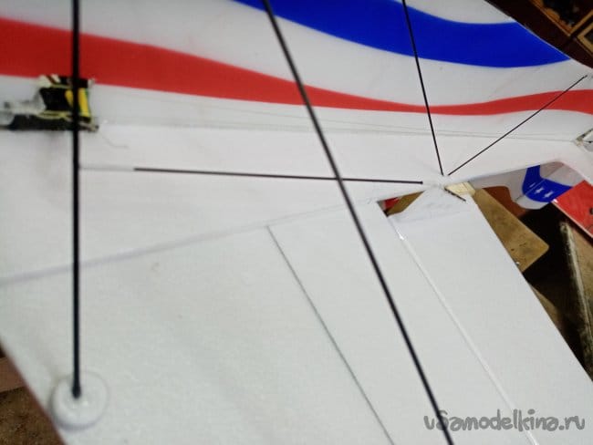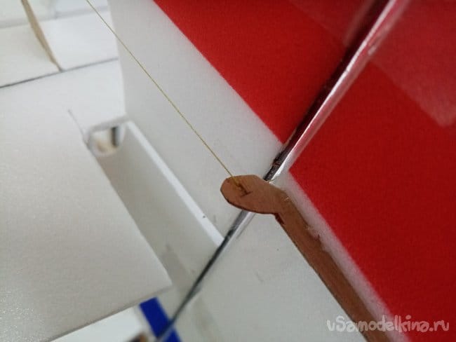 Немного провисли нитки управления на руль направления. В кабанчике прорезаю надфилем небольшой желобок, в него подтягиваю нитку и фиксирую циакрином.