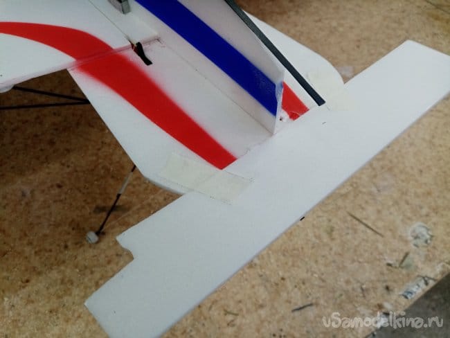 Пардоньте не заметил надломленный компенсатор на крыле. По стандарту, отгибаю слегка побольше, в трещину малость титана на кончике зубочистки и скрепляю малярным скотчем.