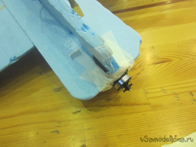 Спустя минут пятнадцать все подвялилось. Снимаю с батареи и подрезаю приклеенные элементы. Монтирую на место угольные планки усиления фюзеляжа. Немного подтачиваю торец, затем на место мотораму и все фиксирую малярным скотчем. Затем вырезаю треугольники усиления моторамы и приклеиваю по местам титаном.
