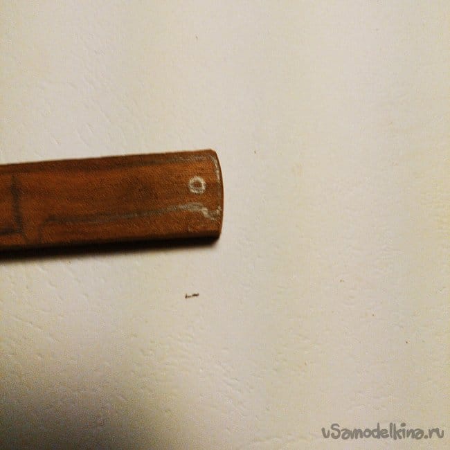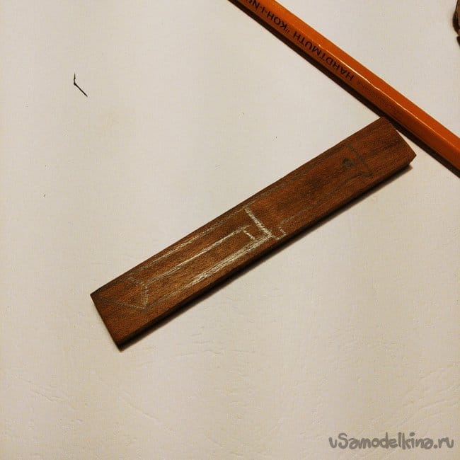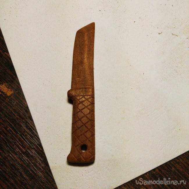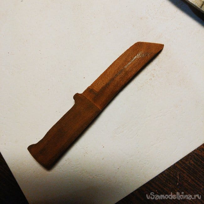 Теперь я решил снять толщину клинка для большей «реалистичности». Для этого я наметил надфилем канавку, до уровня которой нужно снять материал. Брелок я делал односторонний, кстати.