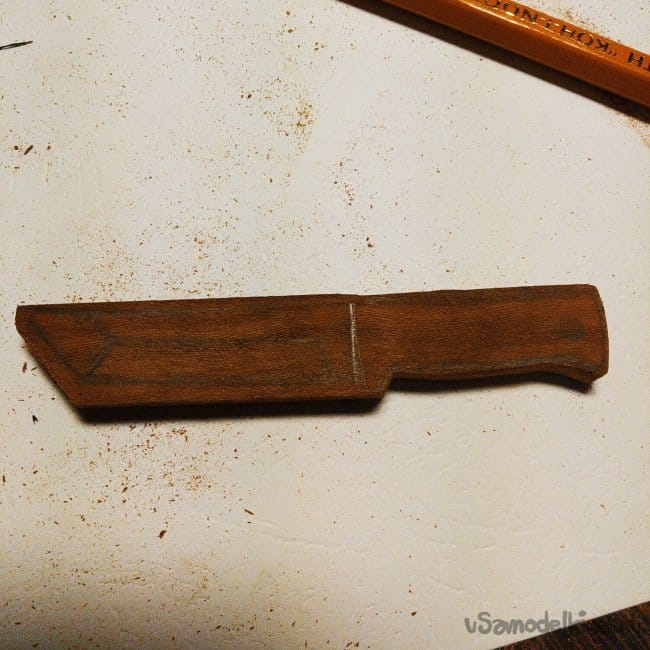Но, поскольку деревяшка не очень длинная, а уменьшать толщину мне не очень хотелось, я немного сжал габариты ножа.