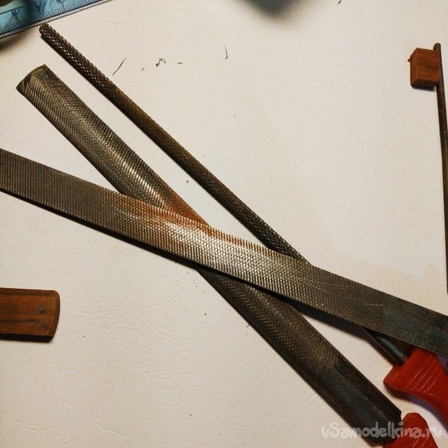 Теперь в бой вступают напильники по металлу, которые довольно быстро из боя вышли. Они особо не пригодились, почти все работы я выполнил рашпилем, который я, разумеется, не сфотографировал.
